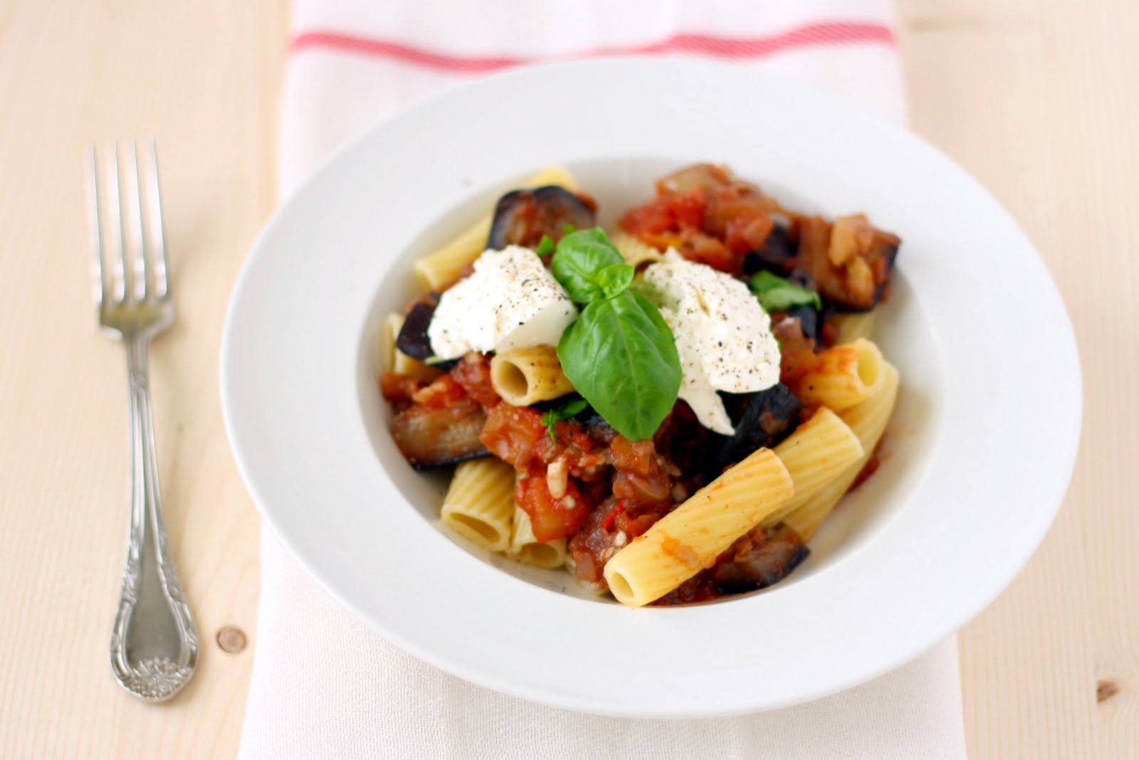 Drain the pasta (without passing it through cold water), mix with sauce and serve decorated with basil leaves and a dollop of ricotta cheese. This cheese is not too fatty, but if you prefer not to use it, your pasta will still be delicious.