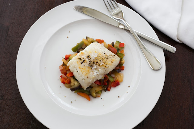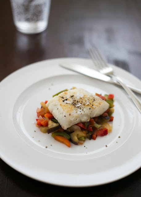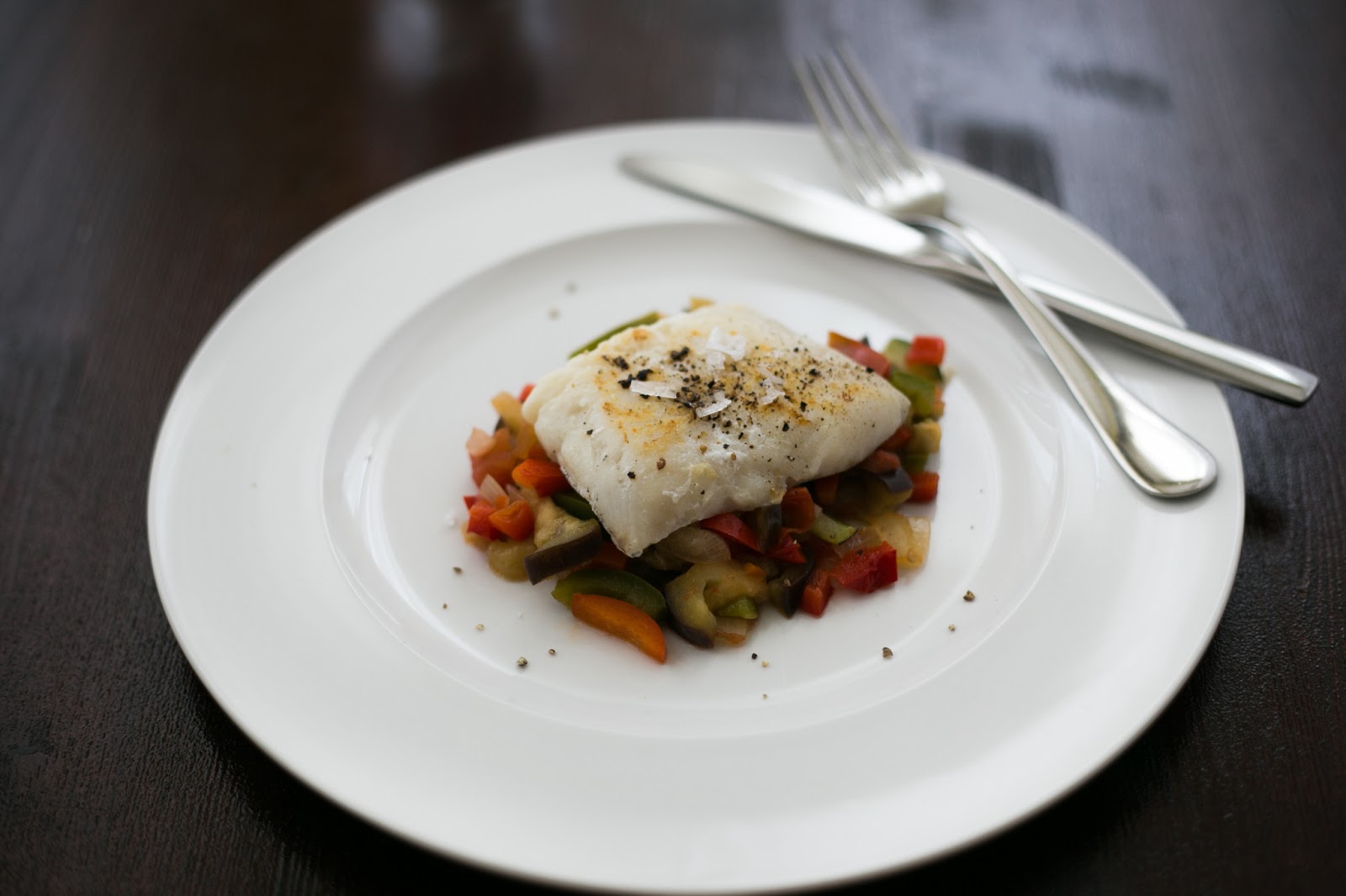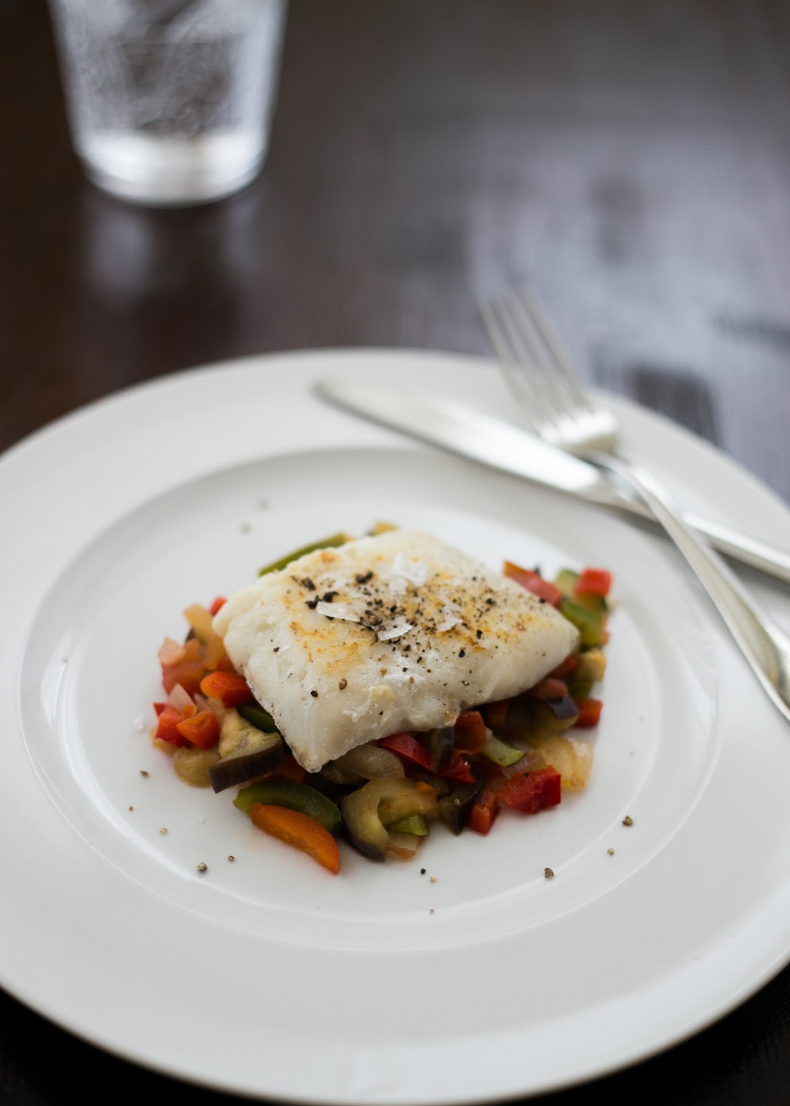 Sirve el pescado sobre el lecho de verduras y añade un poco de pimienta y sal gruesa.