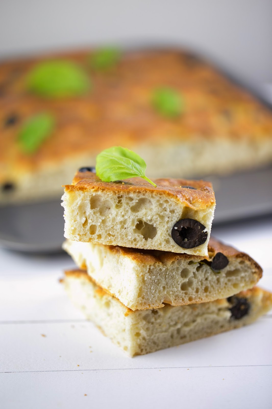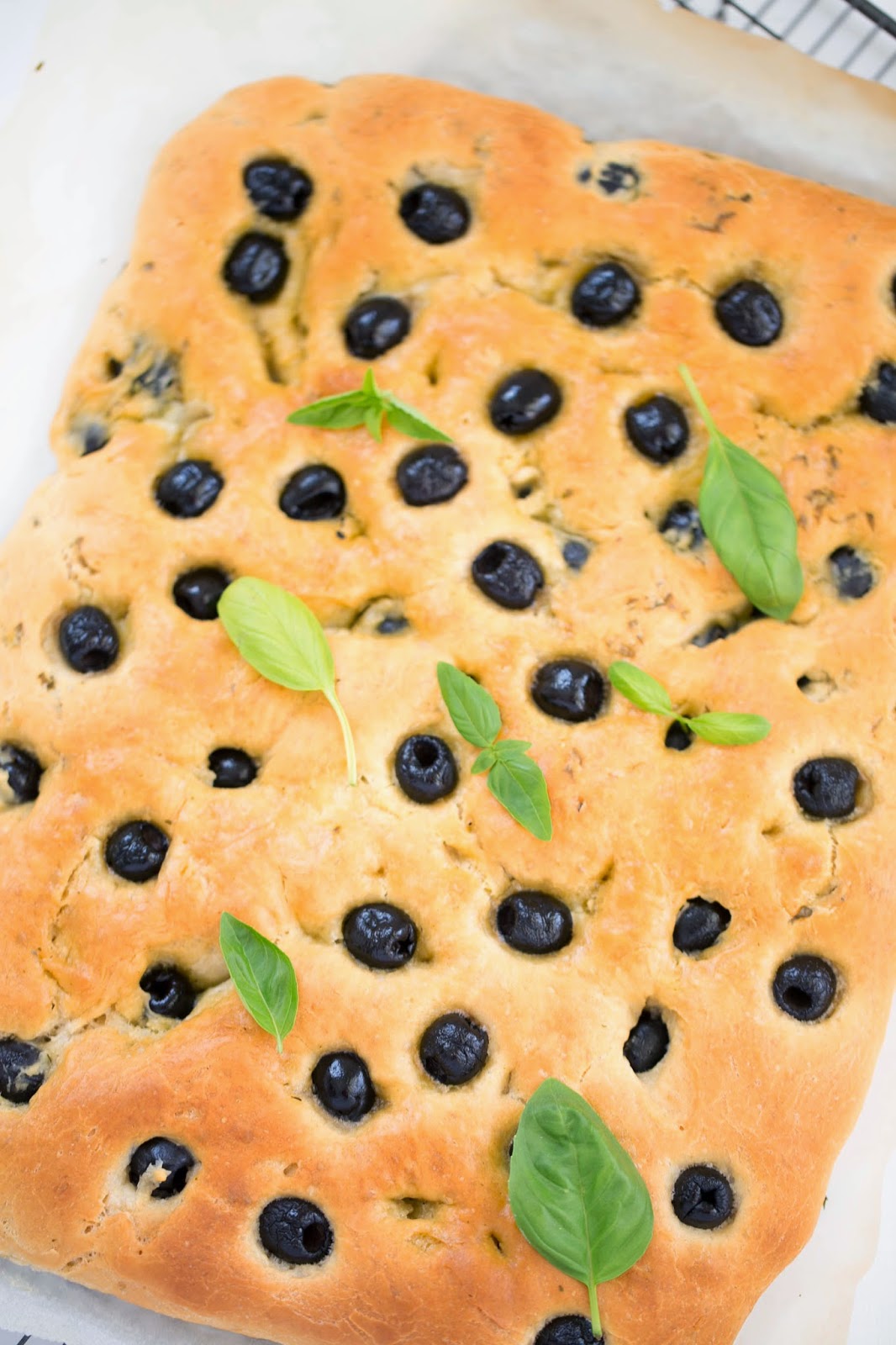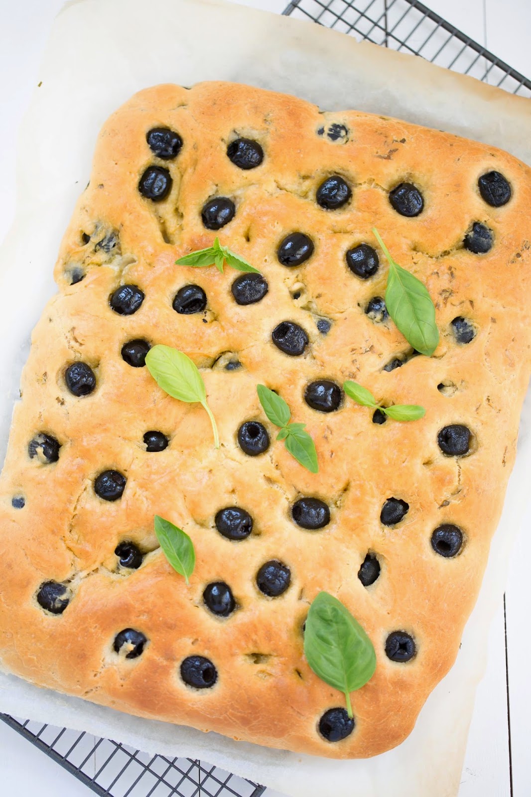 Focaccia de aceitunas negras y albahaca