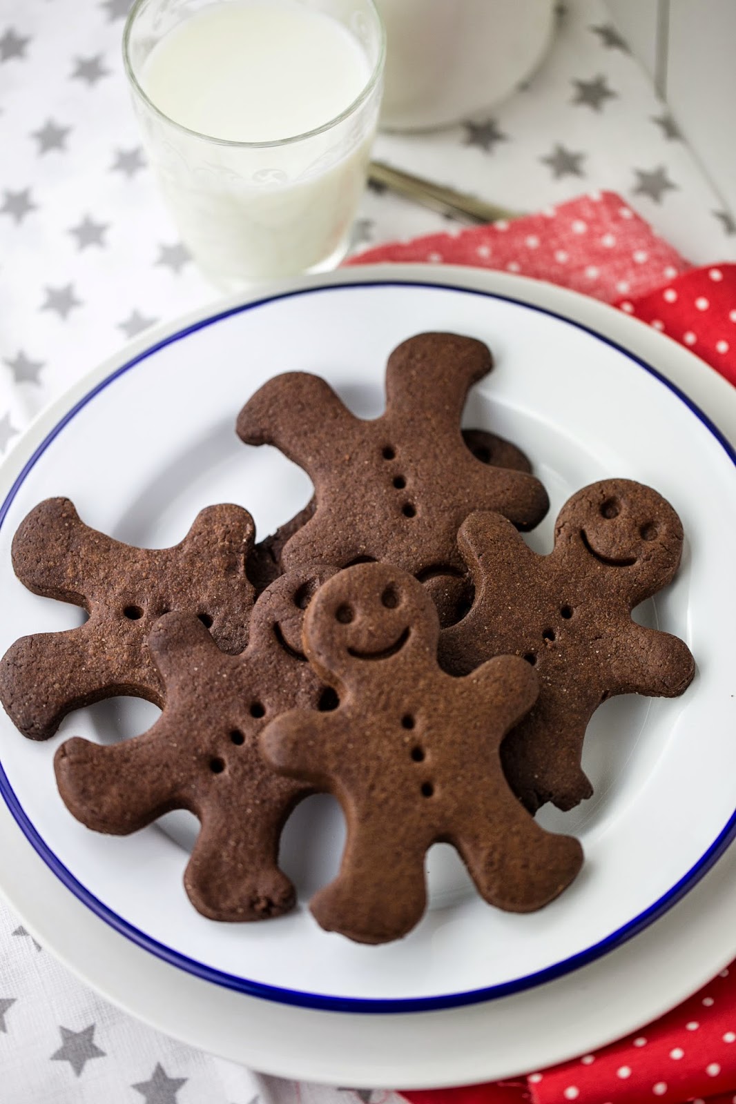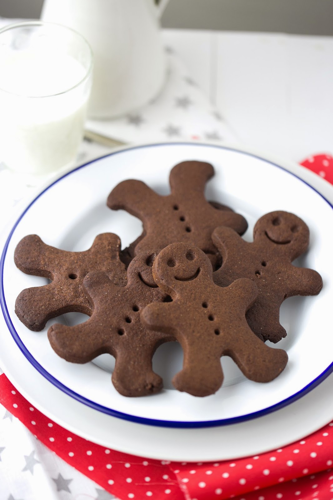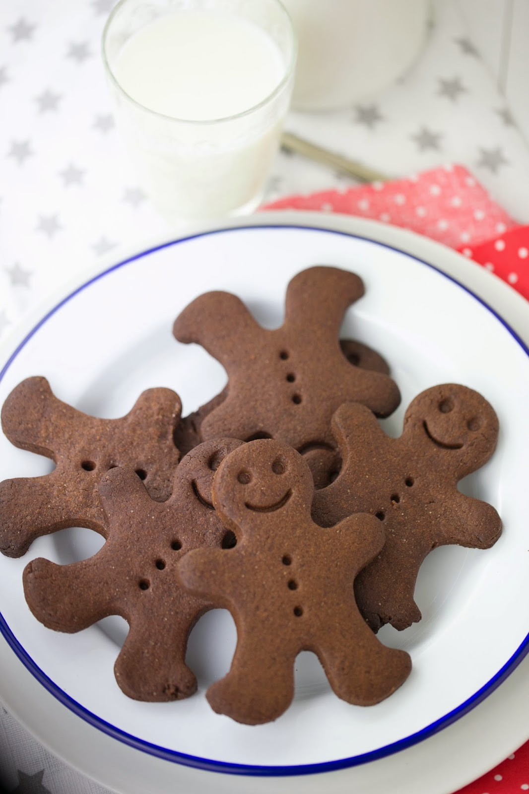 Cometí un error de principiante. No sé si presa de la emoción o simplemente de las prisas y los miles de otras cosas que estaba haciendo al mismo tiempo, pero por algún motivo, no leí la receta entera. Y eso, que es algo básico, que es algo que yo siempre recomiendo a todo el mundo, fue una gran tontería. Porque para cuando tenía la mesa llena de todo lo que os podáis imaginar y un poco más, para cuando había imprimido las plantillas para las distintas piezas y estaba pertrechada de paciencia para la que se me venía encima, entonces seguí leyendo la receta y me di cuenta de que las cantidades de masa eran una barbaridad –pero bueno, hay mucho que construir me dije, yo que soy nueva en estas lides-. También había bastante que esperar entre la preparación de la masa y el momento de poder usarla, lo cual, cuando trabajas con niños es un rollo porque su paciencia es algo que, simplemente, ni está ni se le espera. Pero con las galletas de mantequilla pasa lo mismo, me dije –debía de ser mi espíritu navideño el que seguía dando una respuesta a cada tropiezo del camino-. El problema llegó cuando vi que hacían falta varios días para construir la casa de marras. No daba crédito. Pero si es más rápido hacer una casa prefabricada de verdad que montar esa cosa. Y además necesitaba media cocina para dejarla quieta mientras las piezas secaban. ¿Quién tiene tiempo/ganas/sitio/paciencia y estómago para hacer algo así y luego comerlo? Para mí esto ya era demasiado. Así que como la masa estaba reposando en el frigorífico, decidí que el plan se cambiaba sobre la marcha y saqué el corta galletas de los hombrecitos de jengibre, y en un momento tuvimos un ejército de muñequitos de chocolate. Una, dos, tres bandejas se fueron llenando en lo que empezaba a parecer una factoría.