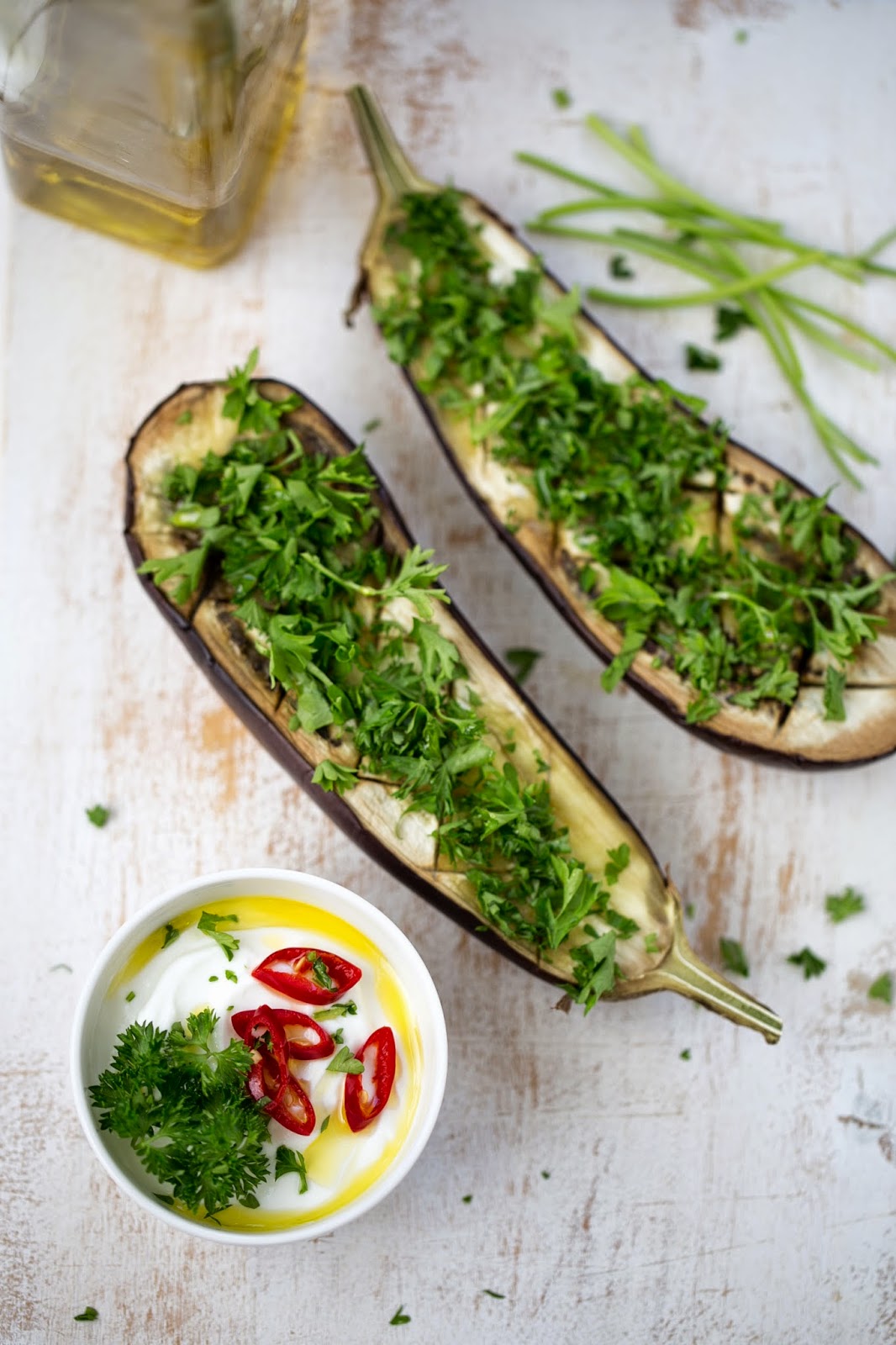 Prepara una salsa mezclando el yogur griego con un diente de ajo picado, el chile y el zumon de limón. Salpimenta, y sirve con perejil y un chorrito de aceite de oliva junto con las berenjenas.